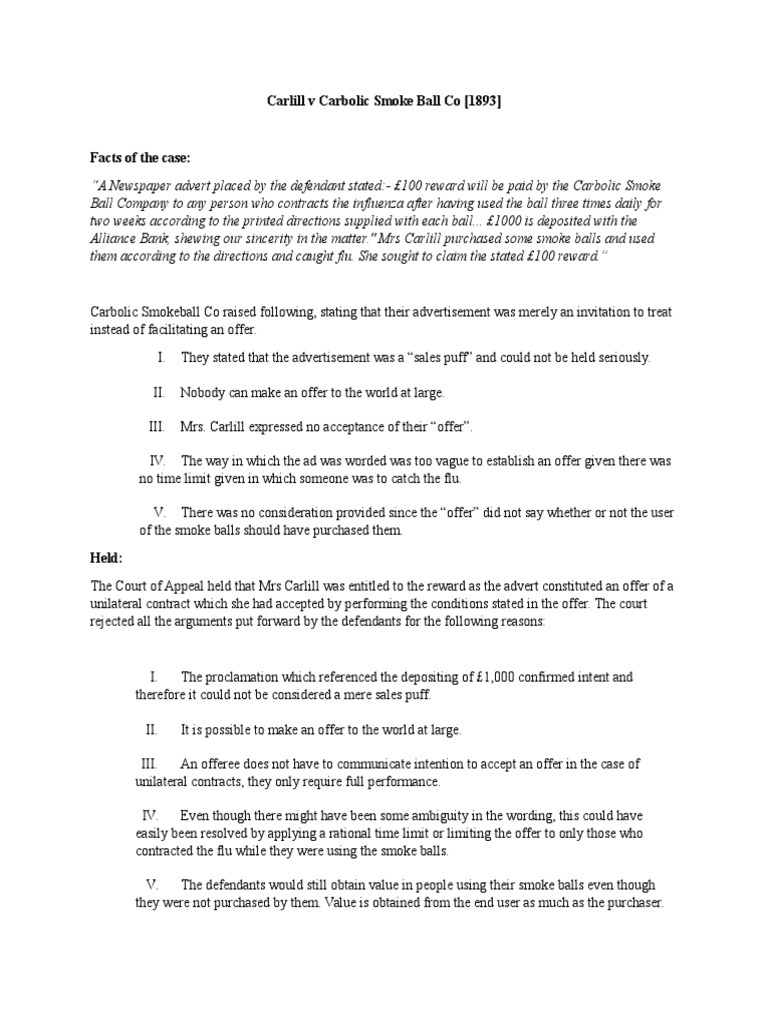 Pdf Case Summary Of Carlill V Carbolic Smoke Ball Co 1892 2 Qb 484 By Datius Didace Datius Didace Academia Edu